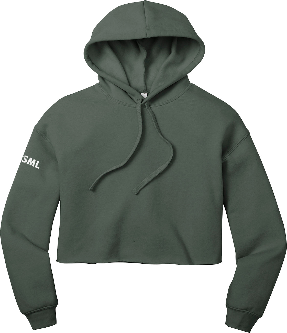 Green cropped hoodie with 'GML' logo on sleeve against a white background